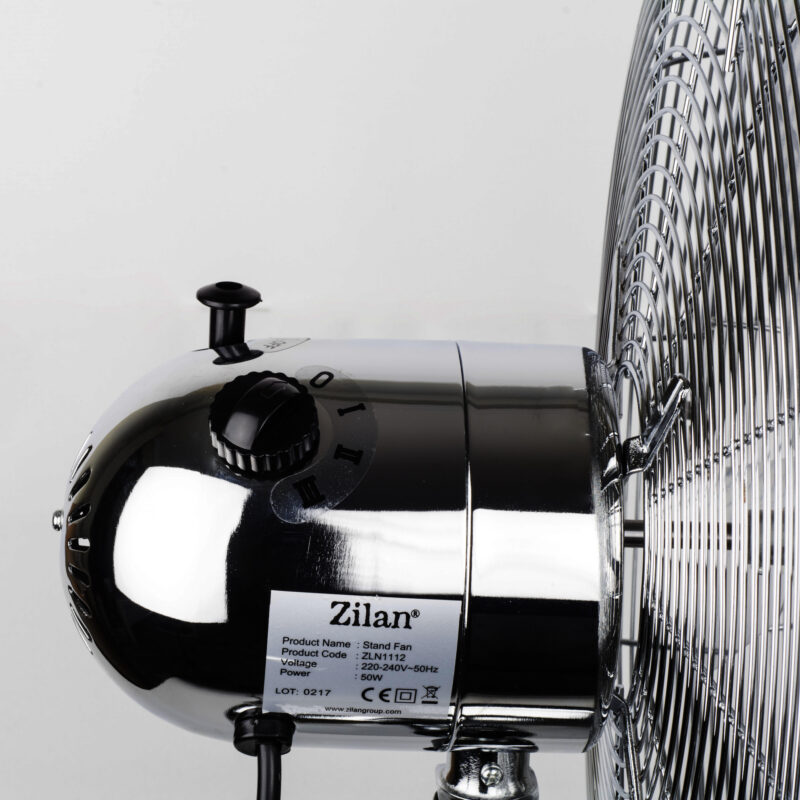 Ventilator inox cu picior ZİLAN ZLN-1112 , Putere 50 W, cu 3 trepte de viteza, oscilatie automata, debit 6000mc/h, maner pentru transport facil, 4 pozitii de ajustare pe verticala, Inaltime reglabila 88-120 cm