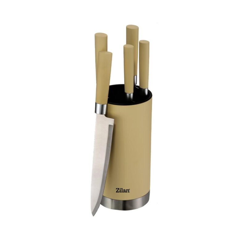 Set cutite 6 piese RETRO Zilan ZLN1610, Suport inclus, Otel inoxidabil 3CR13, Compatibil masina de spalat vase, Crem