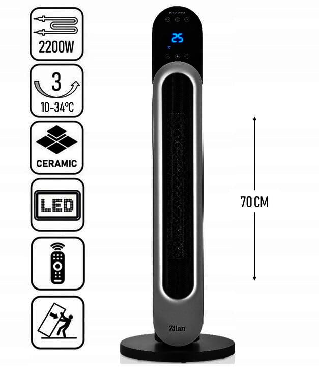 Caracteristici:Elemente de incalzire de inalte eficienta3 setari de functionare2 setari de temperaturaProtectie la supraincalzireProtectie la supraincalzireUnghi larg de oscilareTemperatura reglabila intre 10 si 35 gradeReglare prin ecran tactil si telecomandaTemporizator de 12 oreIndicator LEDComutator de incalzireDimensiuni:Inaltime: 70 cmLatime: 11 cmAdancime: 18 cmGreutate: 4.2 kg