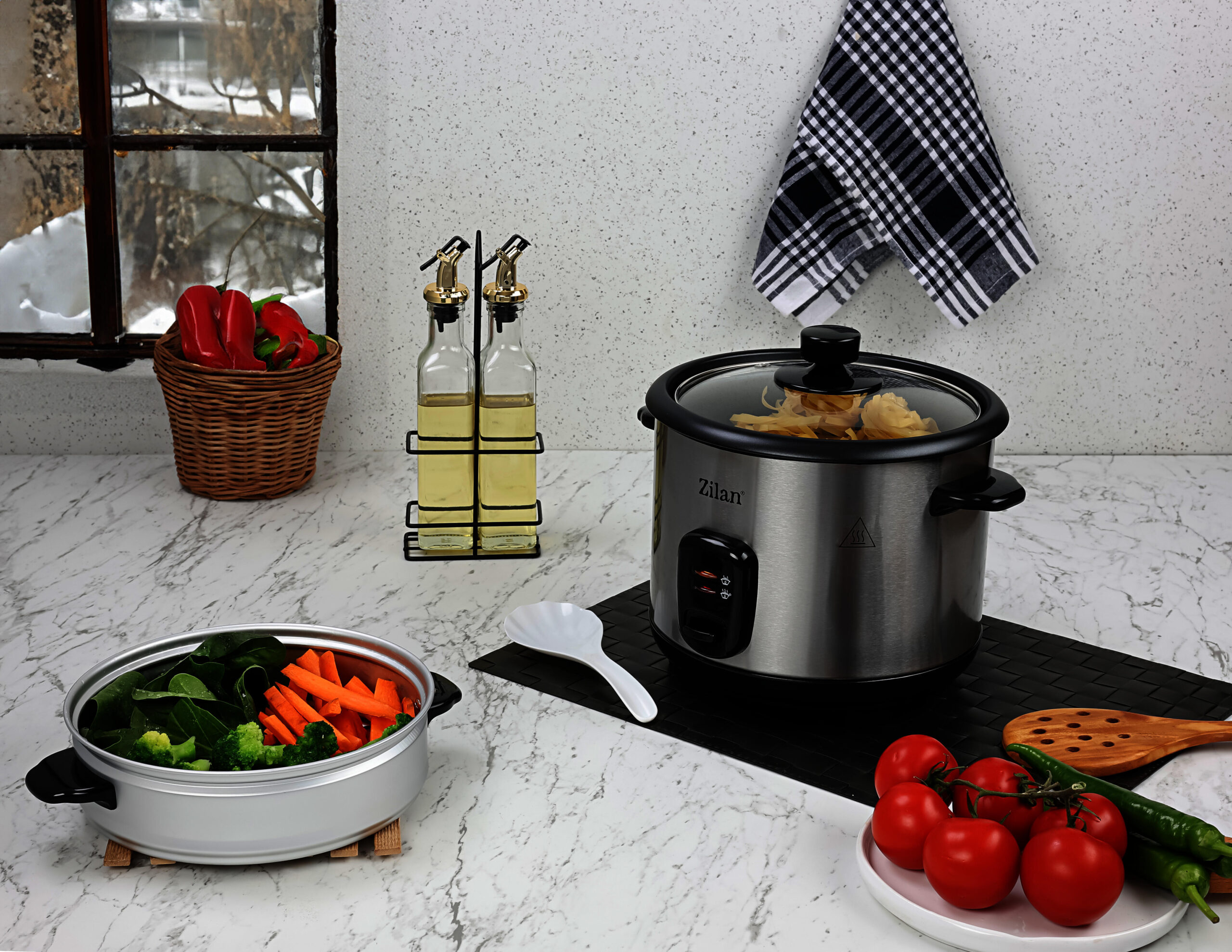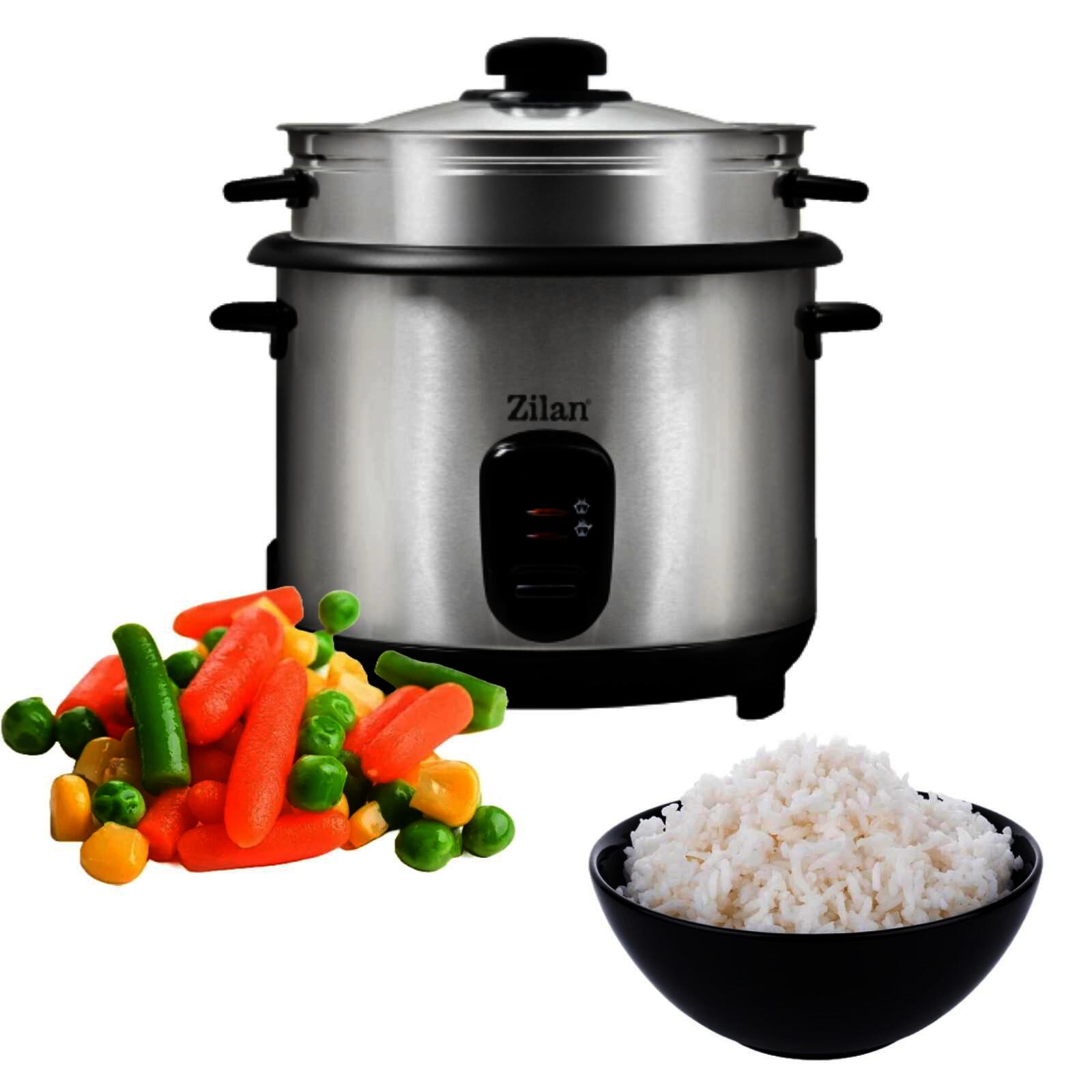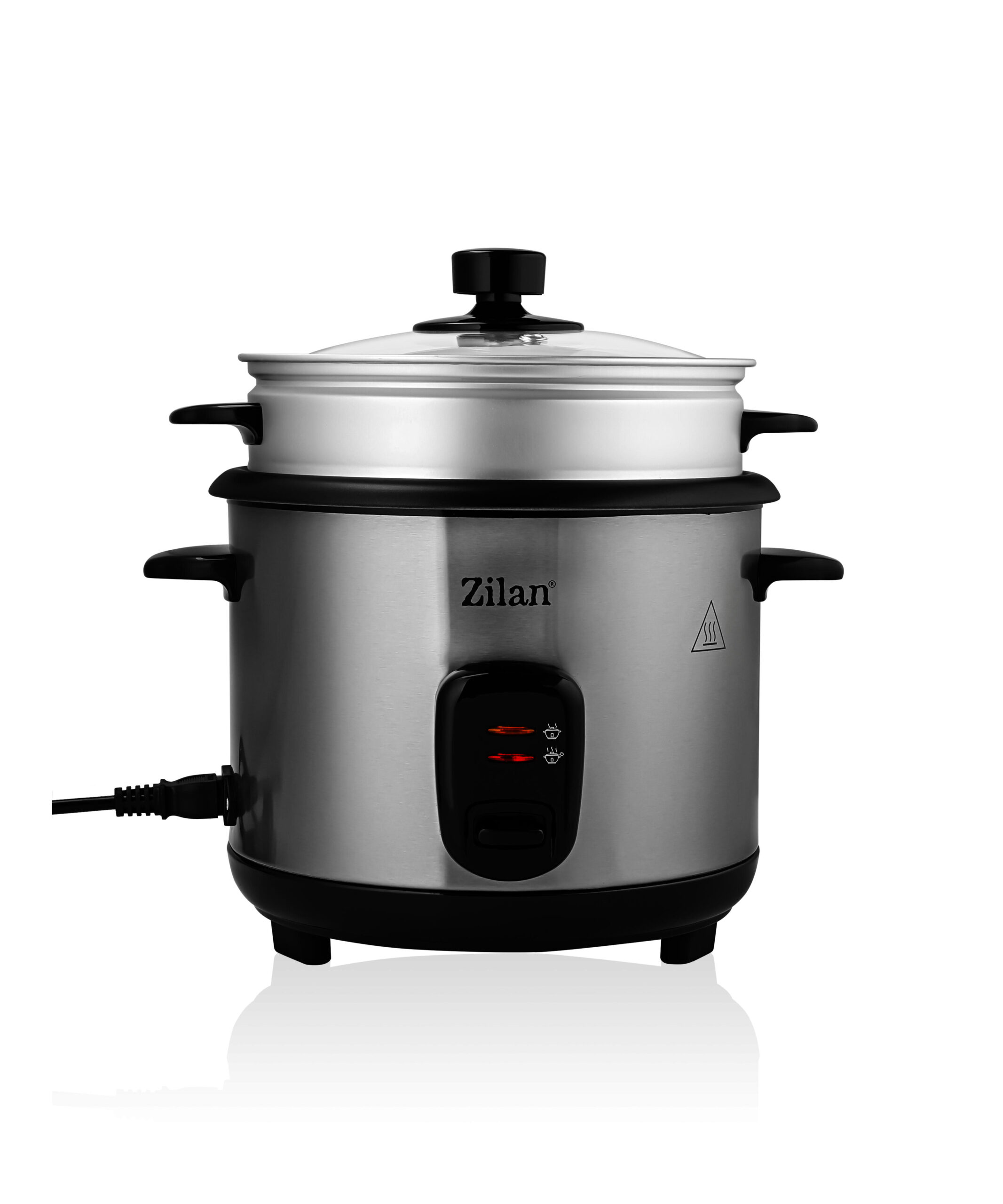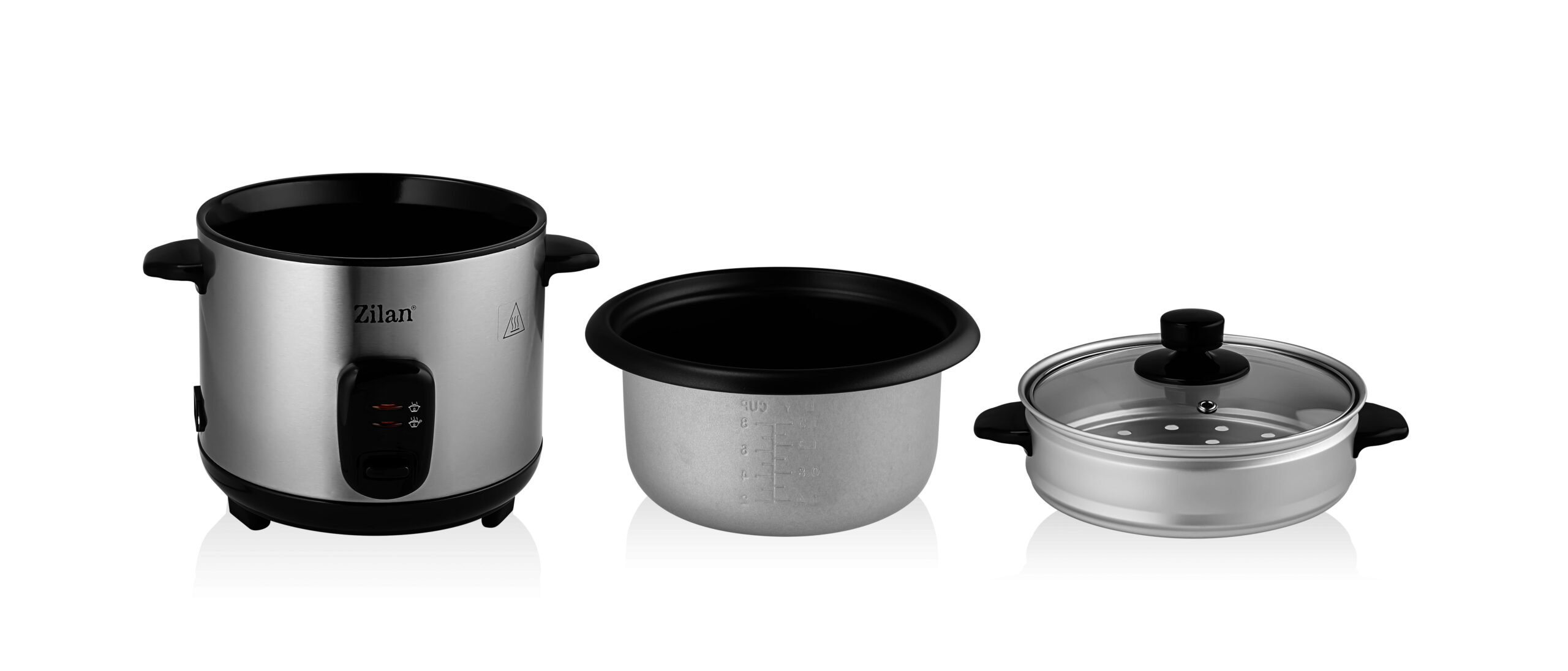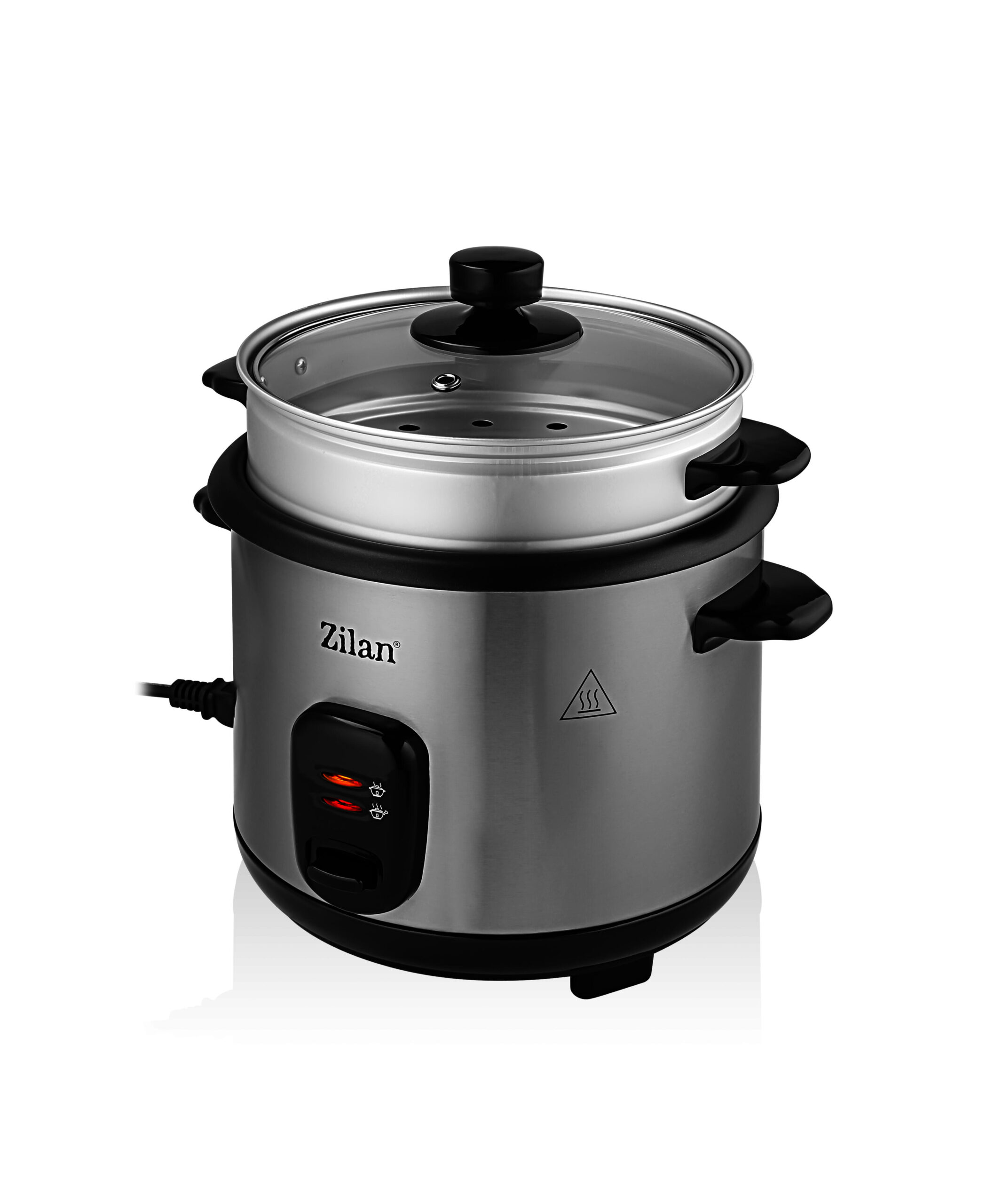 Aparatul de gatit Zilan ZLN9570 2 in 1 pentru gatit orez si alimente la abur dispune de o putere de 500W, o capacitate de 1.5L( capacitate totala de 3,2L, care include atat orezul, cat si apa), suprafete antiaderente, aparatul este foarte versatil si poti gatii multe feluri de preparate cu acesta, incepand de la orez, paste, supa si multe altele!Aparatul este construit dintr-un inox durabil care dispune de o functie pentru a tine mancarea calda, invelis antiaderent, recipient detasabil din aluminiu. Aparatul vine alaturi de un recipient pentru masurarea alimentelor, un capac, un recipient detasabil din aluminiu, o lingura si un recipient pentru masurarea orezului.Pentru siguranta dumneavoastra si a produsului va rugam sa consultati manualul de instructiuni inainte de folosirea aparatului!Caracteristici:Putere500WCapacitate1.5LFunctiiFunctie mentine mancarea calda, Suprafete antiaderente, Recipient de aluminiu detasabil, Buton ON/OFFContinut pachet1x Aparat gatit, 1x Recipient aluminiu, 1x Lingura, 1x Recipient masurat, 1x Cablu alimentareMaterialInoxTensiune220-240VFrecventa50/60HzDimensiuni:Inaltime30 cm Diametru21.2 cm