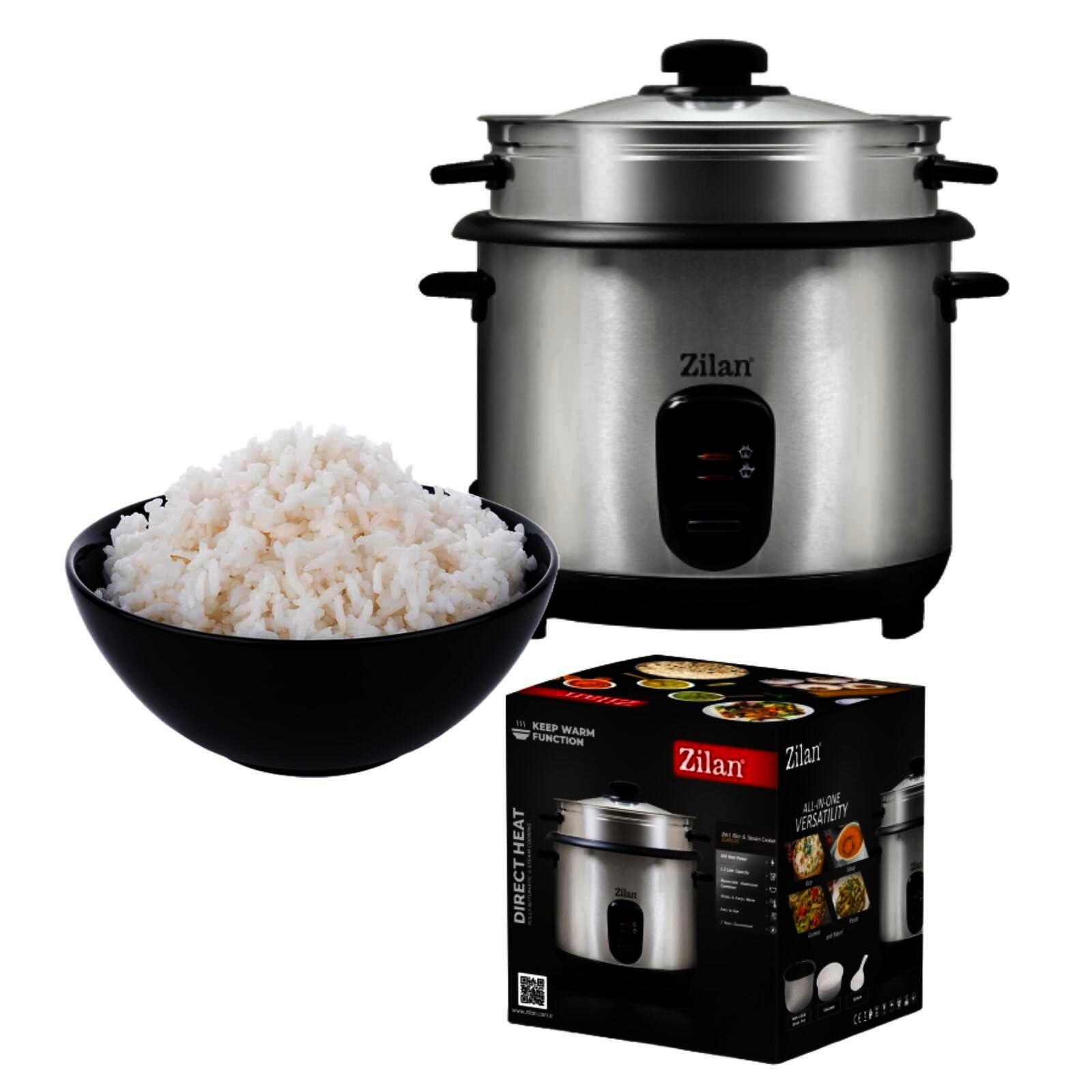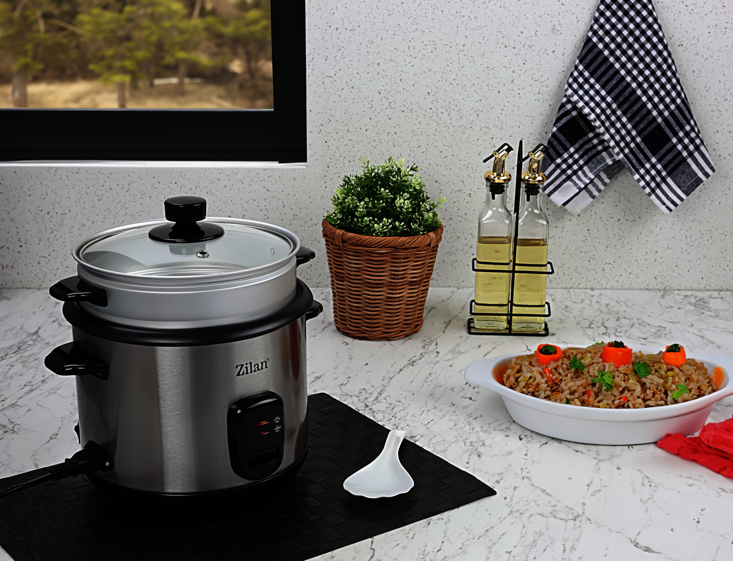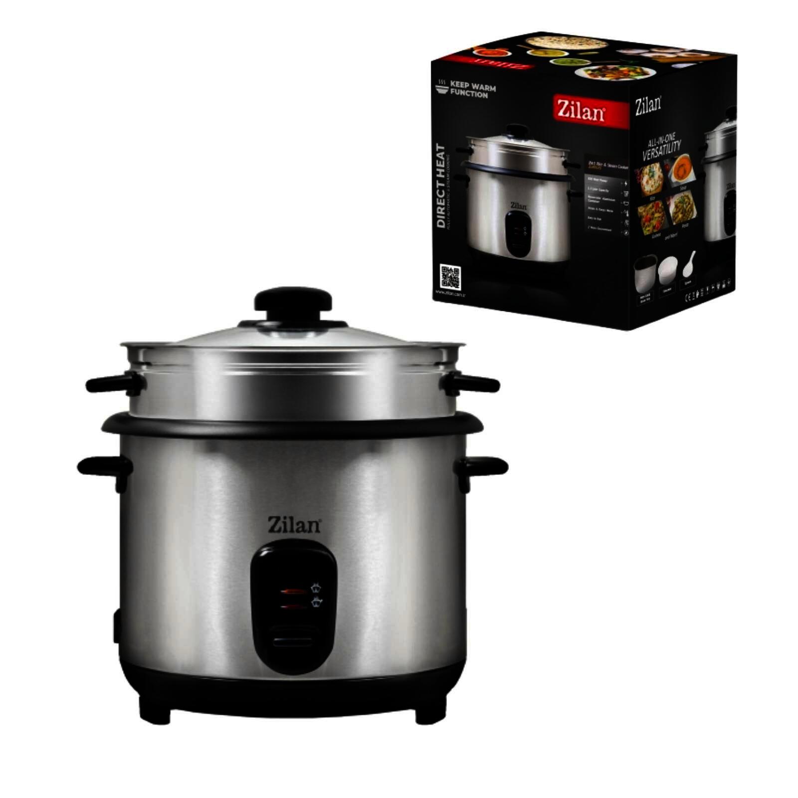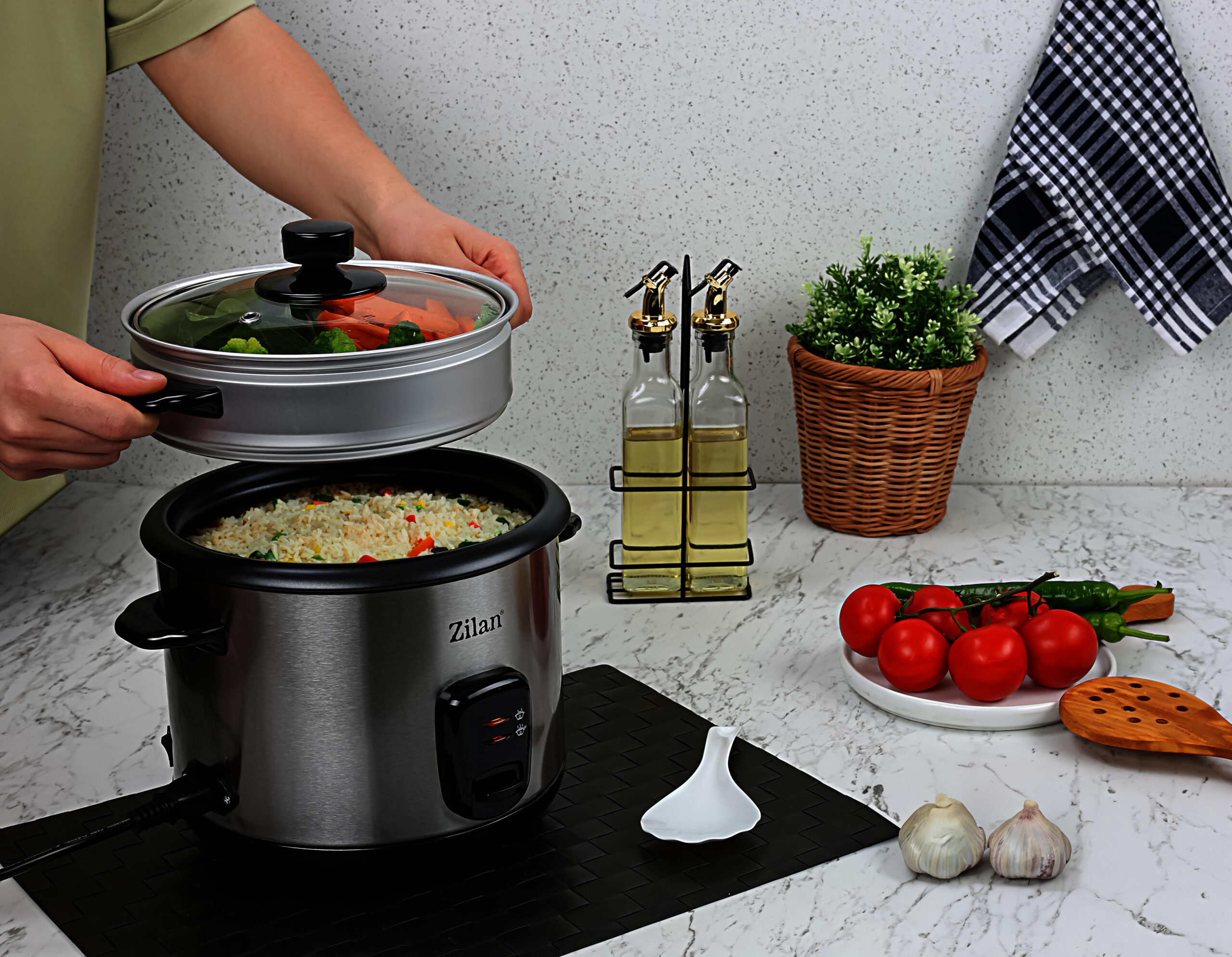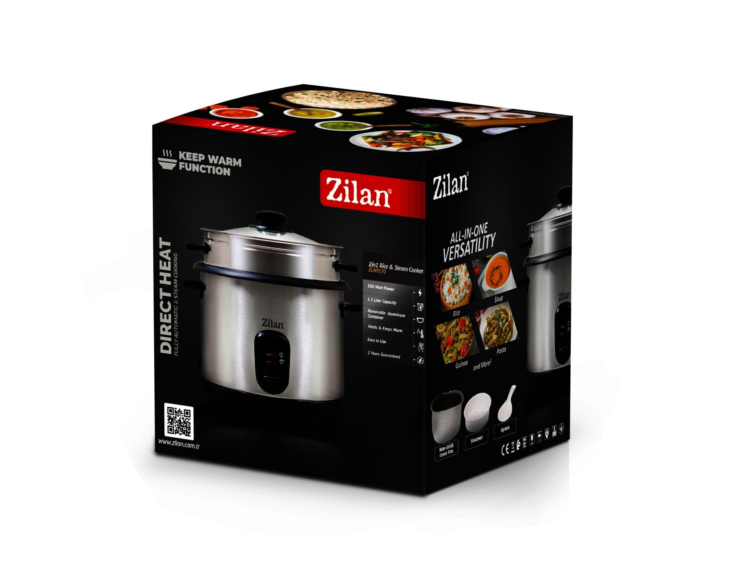Aparatul de gatit Zilan ZLN9570 2 in 1 pentru gatit orez si alimente la abur dispune de o putere de 500W, o capacitate de 1.5L( capacitate totala de 3,2L, care include atat orezul, cat si apa), suprafete antiaderente, aparatul este foarte versatil si poti gatii multe feluri de preparate cu acesta, incepand de la orez, paste, supa si multe altele!Aparatul este construit dintr-un inox durabil care dispune de o functie pentru a tine mancarea calda, invelis antiaderent, recipient detasabil din aluminiu. Aparatul vine alaturi de un recipient pentru masurarea alimentelor, un capac, un recipient detasabil din aluminiu, o lingura si un recipient pentru masurarea orezului.Pentru siguranta dumneavoastra si a produsului va rugam sa consultati manualul de instructiuni inainte de folosirea aparatului!Caracteristici:Putere500WCapacitate1.5LFunctiiFunctie mentine mancarea calda, Suprafete antiaderente, Recipient de aluminiu detasabil, Buton ON/OFFContinut pachet1x Aparat gatit, 1x Recipient aluminiu, 1x Lingura, 1x Recipient masurat, 1x Cablu alimentareMaterialInoxTensiune220-240VFrecventa50/60HzDimensiuni:Inaltime30 cm Diametru21.2 cm