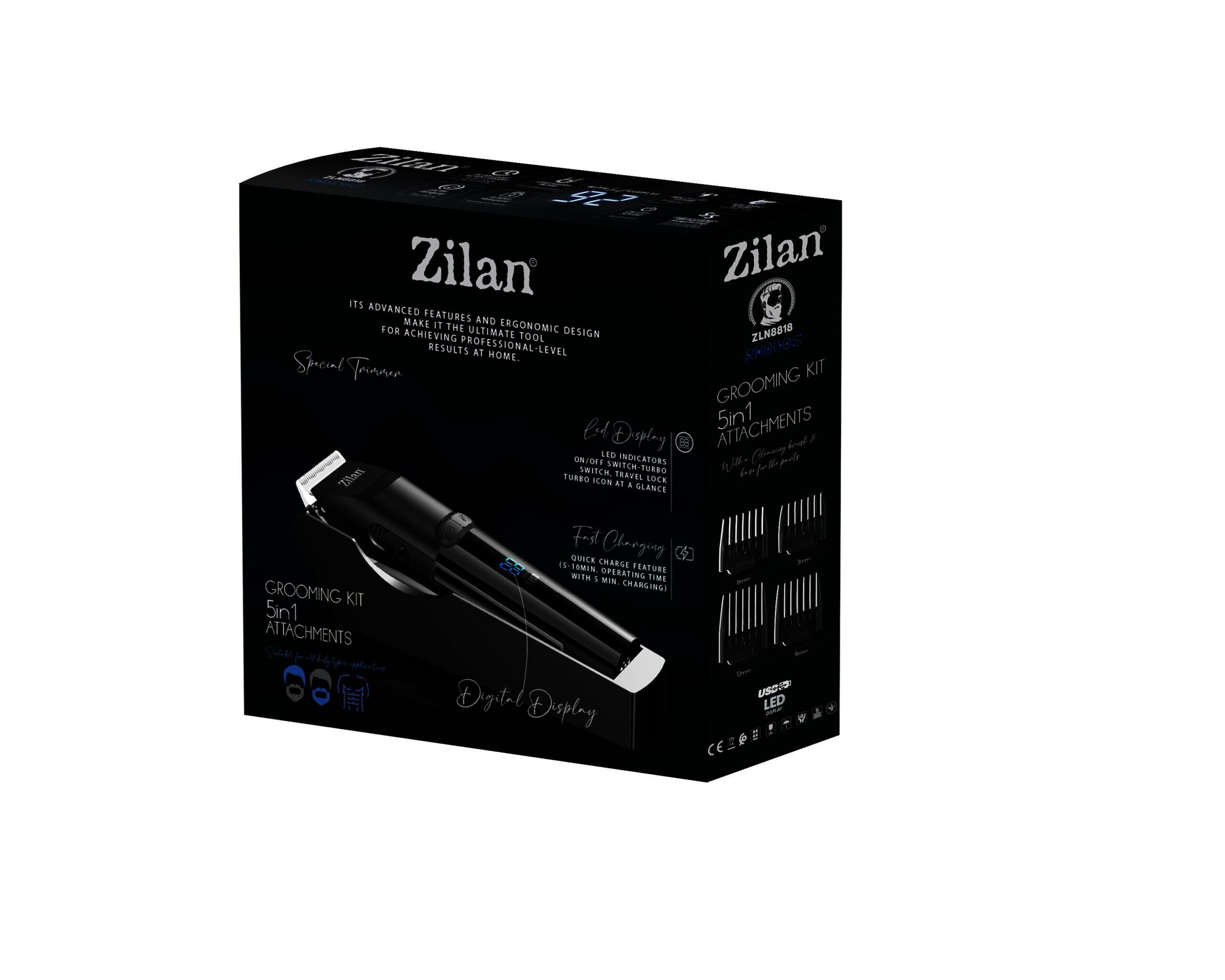 Aparatul de tuns trimmer Zilan ZLN8818 Rhodos 5 in 1 detine o baterie Li-ion de capacitate 700mAh. Pentru 90 de minute de incarcare, aparatul poate fi folosit 60 de minute. Pentru o utilizare mai usoara aparatul de tuns poate fi folosit cu cablu sau fara.De asemenea aparatul de tuns are functia de blocare pentru calatorie / traveling.Aparatul de tuns parul Zilan ZLN8818 are lame din otel inoxidabil, afisaj LED si buton pentru Turbo.Aparatul poate fi folosit pe orice suprafata a corpului, incepand de la par, barba pana la parul corporal.In pachetul produsului se regasesc 4 grile pentru marimi: 3mm, 6mm, 9mm si 12mm.