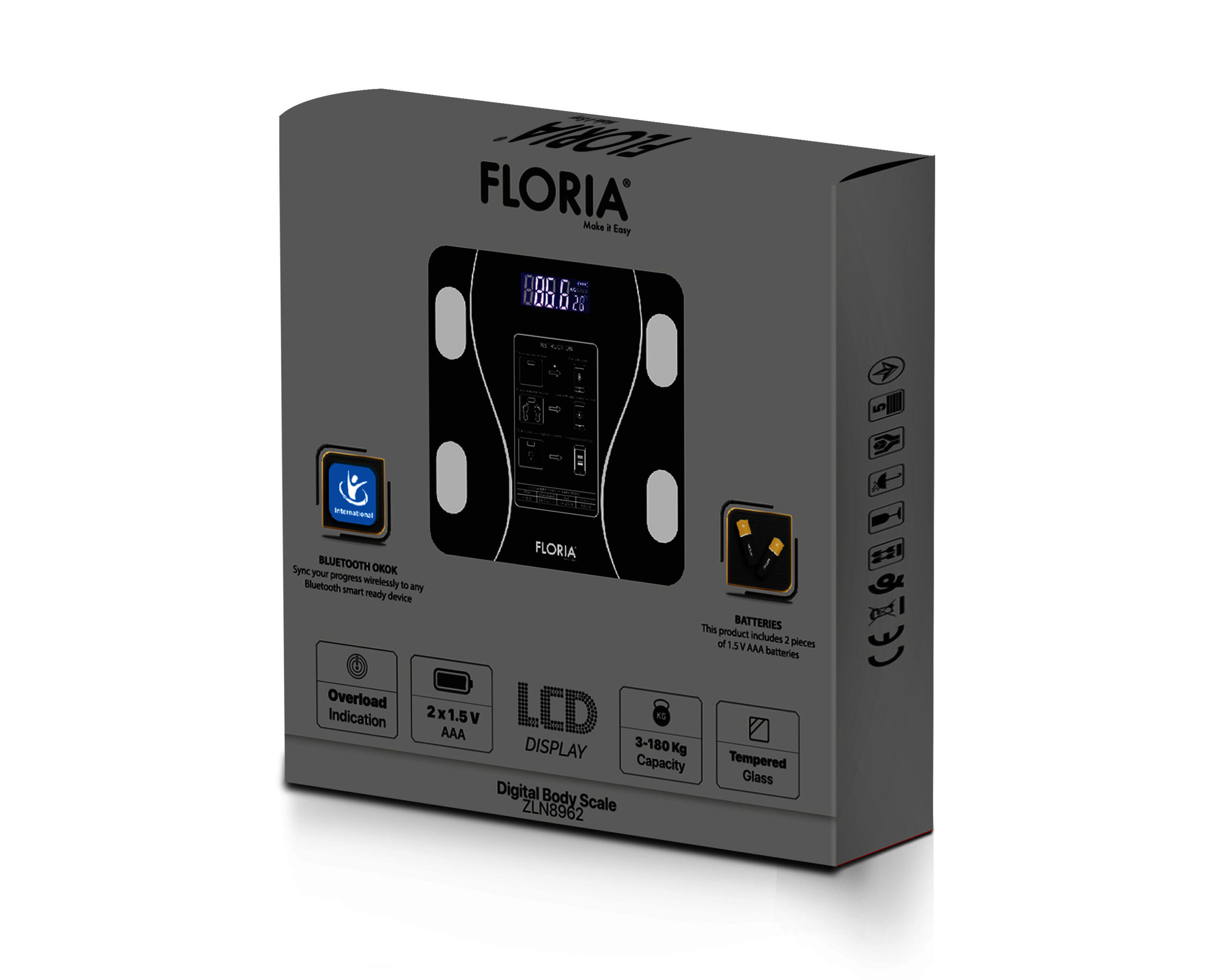 Cantarul electronic de persoane Floria ZLN8962 este de culoare neagra si este construit din sticla. Acesta are performanta de a cantarii pana la maxim 180 kg. Cantarul poate cantarii intre greutatile 3 si 180 de kg. Acesta are functiile de resetare automata la zero, Auto ON/OFF si indicator de baterie slaba / supraincarcare. Greutatea este afisata pe un display LCD.Cantarul ofera posibilitatea de a schimba unitatea de masura. Cantarul poate masura in unitatile de masura: Kg/Lb/St.Produsul fiind unul de ultima generatie inteligent acesta va ofera posibilitatea de a va conecta la el prin aplicatia OkOk pentru a va afisa mai multe detalii despre masuratorile efectuate.Cantarul functioneaza pe baza a 2 baterii de tip AAA. In pachetul cantarului se regasesc 2 baterii de tip AAA.Specificatii:Capacitate3-180 kgMaterialSticlaFunctiiResetare automata la zero, Auto ON/OFF, indicator baterie slaba / supraincarcare, Display LCD, Aplicatie OkOk