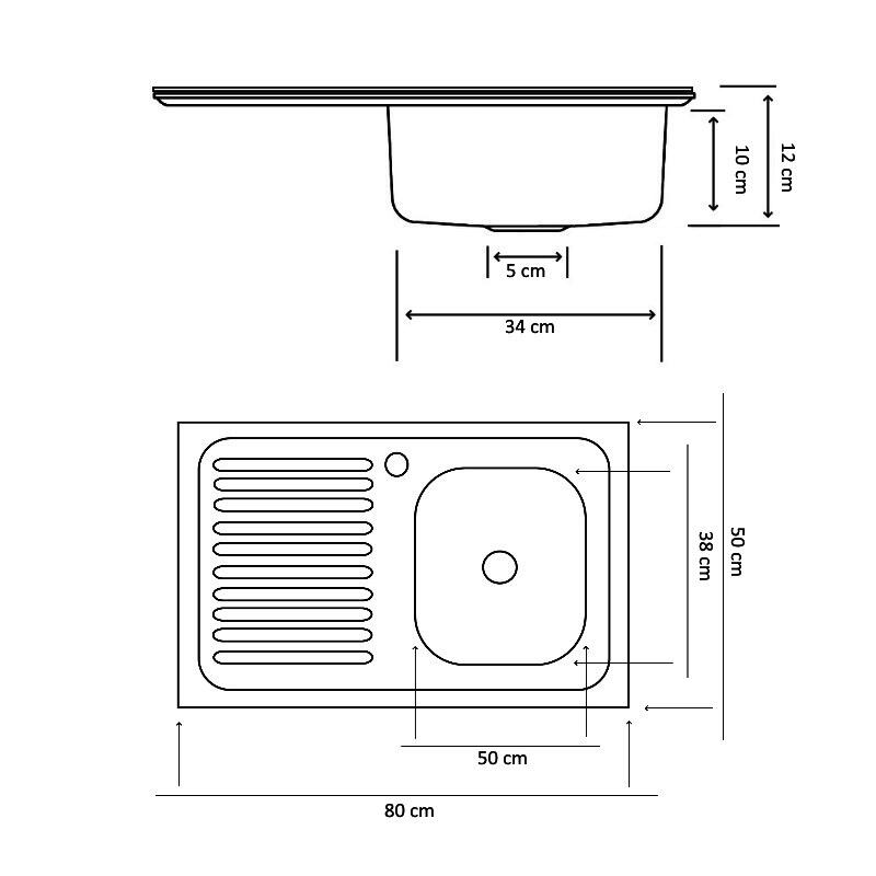 Chiuveta inox pentru masca 0,4 mm. Tip finisaj : satin (Lucios). Disponibila cu cuva pe dreapta. Este prevazuta cu gaura pentru baterie (3,5 cm.) si guler la perete. Specificatii: – Dimensiune : 50 x 80 cm.; – Adancime : 9 cm.; – Grosime : 0,4 mm.CARACTERISTICI GENERALETip produsChiuvetaTipCu picuratorPozitie montareDreaptaTip montareIncastratTip aerisireFara preaplinUtilizareInteriorFormaDreptunghiNumar cuve1MaterialInoxFinisajLuciosContinut pachet1 Chiuveta + sifonCuloareInoxDIMENSIUNILungime800 mmLatime500 mmAdancime cuva90 mmDimensiune cuva (mm)340 x 380Diametru scurgere57 mmDimensiuni spatiu montare (mm)500 x 800Greutate2 Kg