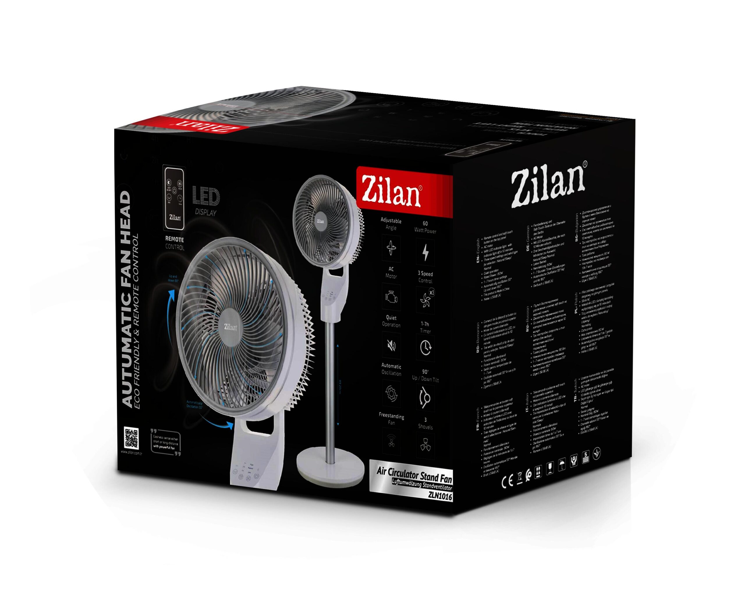 Circulatorul de aer de birou Zilan ZLN1016 dispune de o putere de 60W, 3 trepte de viteza, avand un motor AC care ofera destula putere pentru a va indeplinii asteptarile dar in acelasi timp silentios emitand un zgomot de ≤ 59 dB. Circulatorul este dotat cu oscilatie automata de pana la 55 de grade si inclinatie de pana la 90 de grade. Circulatorul va ofera posibilitatea de a-i ajusta unghiul.Circulatorul de aer va ofera posibilitatea de a-i seta timpul prin functia Timer de la 1 pana la 7 ore.Controlul aparatului se face prin panoul de control amplasat pe produs sau prin telecomanda acestuia.Circulatorul beneficiaza de 3 trepte de viteza, prima treapta fiind una joasa, cea de a 2-a fiind medie si cea de a 3-a fiind inalta.Inaltimea totala: 89.2 cmDiametrul: 23.5 cmSpecificatiiPutere60WTrepte de viteza3 trepteNivel zgomot≤ 59 dBOscilatie55 de gradeInclinatie90 de gradeTimer1 – 7 oreFunctiiTimer, Indicator luminos, Motor AC, Unghi ajustabil, Oscilatie, Silentios, Telecomanda