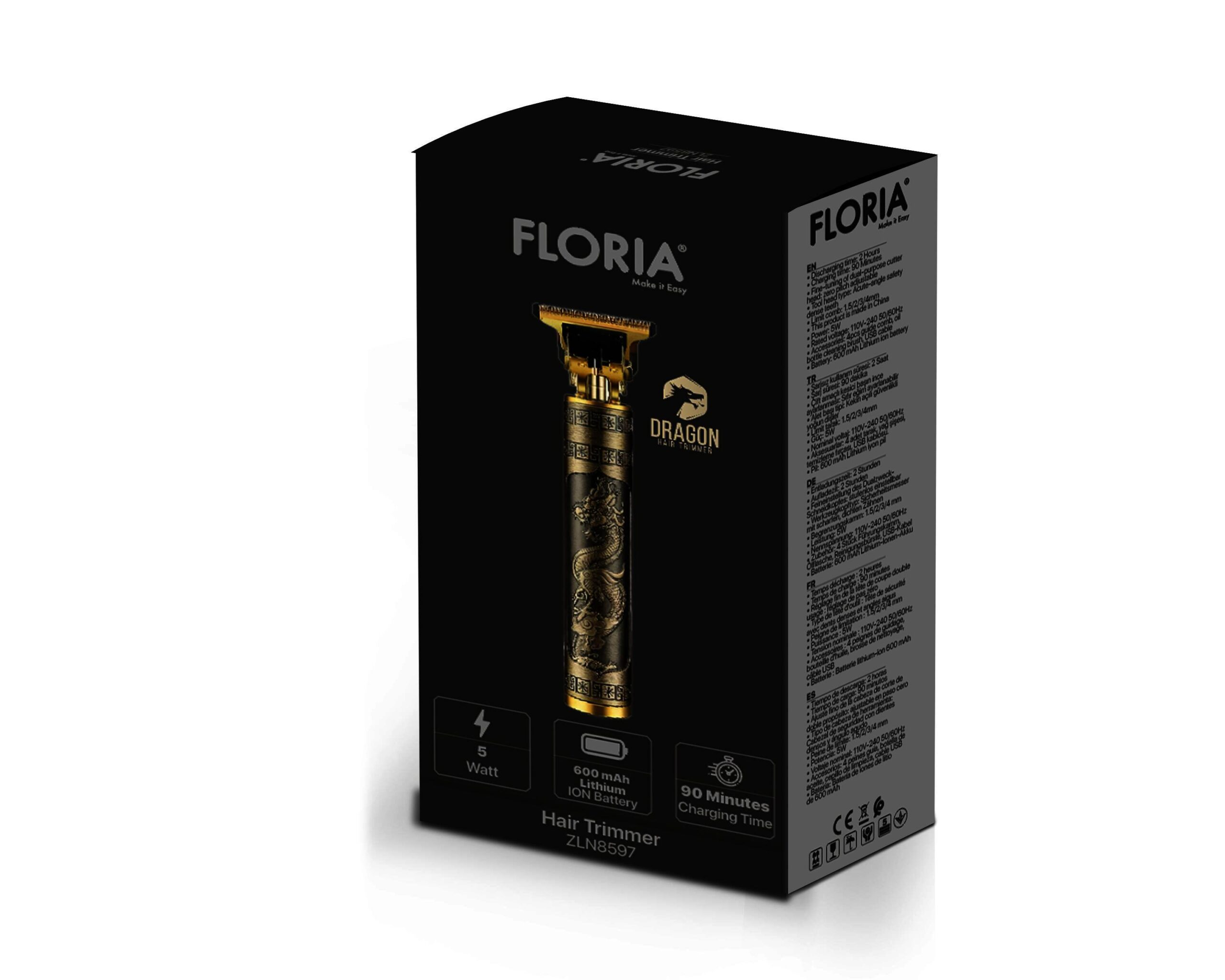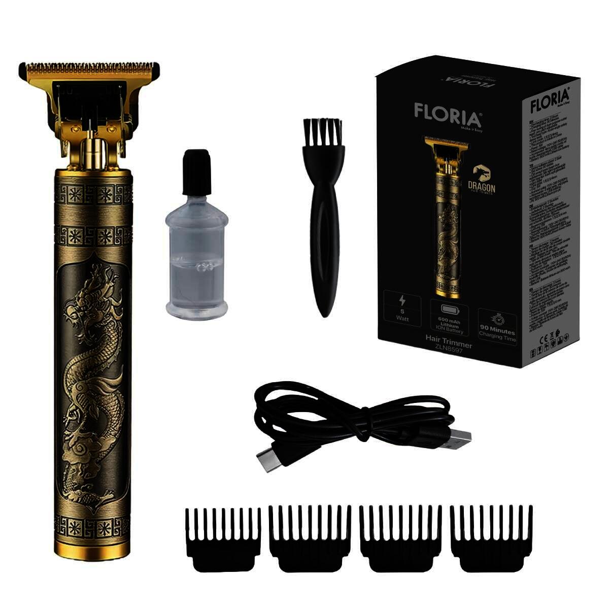 Masina de tuns Floria ZLN8597 este o masina de tuns cu un aspect placut, aceasta are gravat un design in forma de dragon. Aceasta are putere de 5W, are o singura treapta de viteza si beneficiaza de 4 gratare pentru a permite ajustarea nivelului de tundere. In pachetul produsul acesta vine alaturi de 4 gratare, un cablu USB pentru incarcare, o periuta pentru curatare si o sticluta de ulei pentru ungere.Caracteristici:- 1 treapta de viteze- Putere 5W- Include 4 gratare pentru a ajusta nivelul- Incarcator USB inclus in pachet- Perie de curatare inclusa- O sticluta de ulei inclusa