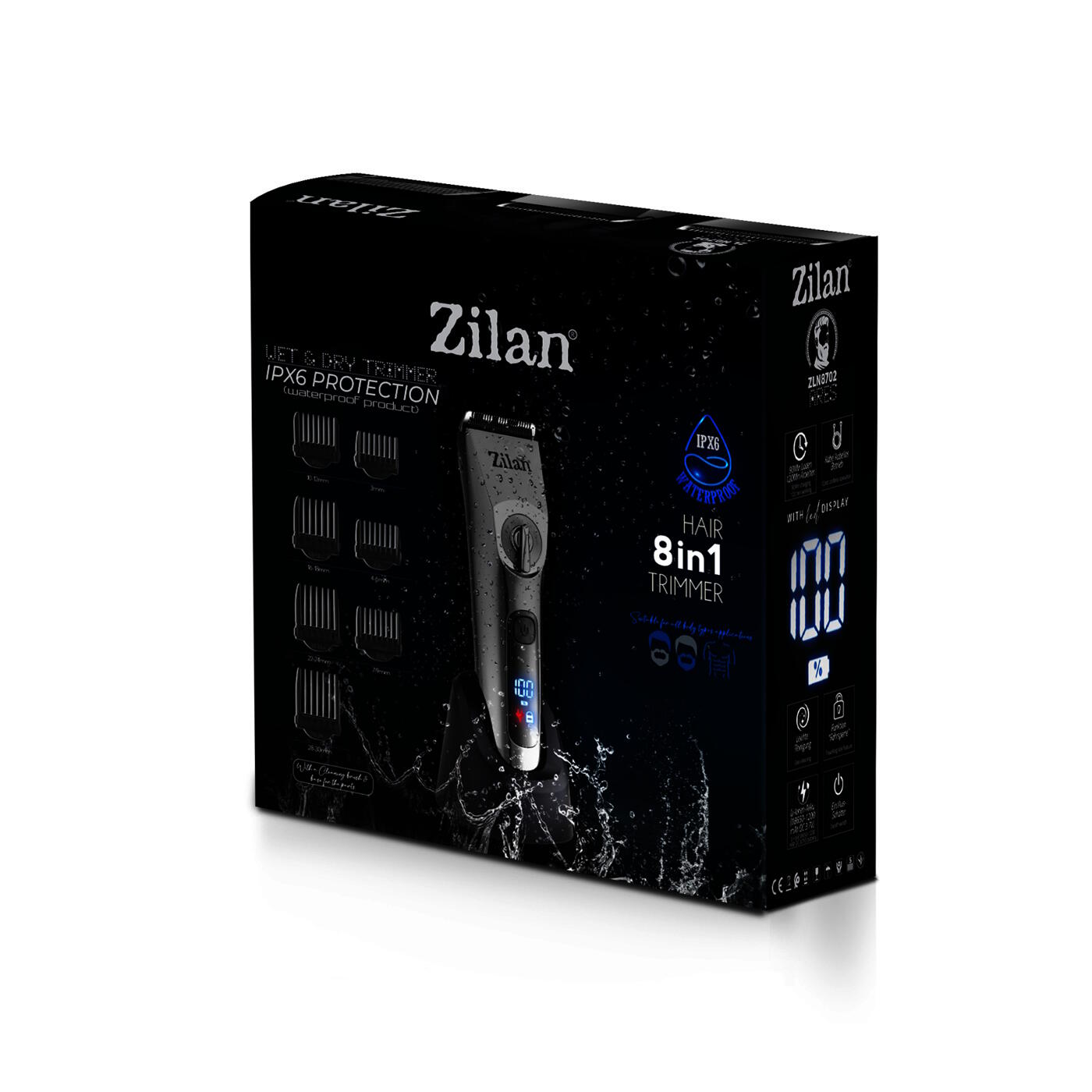 Caracteristici generale:Afisare LED – Aparatul afiseaza digital nivelul bateriei si momentul cand capatul este blocat pentru sigurantaIncarcare USB – Produsul vine la pachet cu un cablu special, FARA capatul de bagat in prizaAutonomie de 120 de minute – Cu o incarcare completa, aparatul poate fi folosit intr-un interval de 120 de minuteDimensionare stadard de 05 – 2.5 mm – Aparatul are in dotare dimensionarea generala reglabilaIncarcare de 90 de minute – Pentru o incarcare completa, sunt necesare doar 90de minute7 capete de utilizare – Aparatul de ras Zilan ZLN8702 are in dotare 7 capete cu dimensiuni diferitePerie de curatat – In pachet este inclusa si o perie pentru curatarea lamelorSac pentru depozitare – Pentru o depozitare mai sigura, in cutie se mai afla si un saculet pentru acest aparat.Suport pentru aparat – Pachetul contine incarcator tip suport pentru aparatul de tunsAparat de tuns electric 8 in 1, pentru barbati reincarcabil IPX6, LED, gri.Caracteristici:– protectie IPX6;– incarcare rapida;– utilizare cu fir sau fara fir;– ecran LED;– marimi de ras: 3/4-6/7-9/10-12/16-18/22-14/28-30mm– incarcare USB;– perie de curatat;