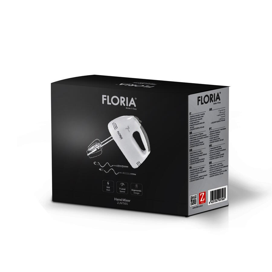 Mixer de mana Floria ZLN7565, ALB Putere 100 W, 7 viteze, Buton eliberare accesorii
