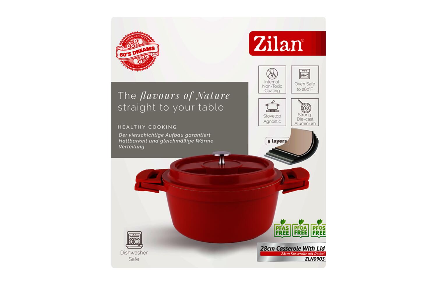 Oala cu capac RETRO Zilan ZLN0903 de culoare rosie este construita din 5 straturi de material aceasta avand o acoperire interna din ceramic, partea inferioara avand strat compatibil cu inductie, aceasta avand in componenta aluminiu puternic turnat sub presiune. Oala are o capacitate de 6.3L, dimensiune de 28 de cm si are o inaltime de 13 cm. Oala beneficiaza de acoperire interioara non-toxica ( PFAS FREE, PFOA FREE, PFOS FREE si fara PTFE). Oala este compatibila cu utilizarea in cuptor dar temperatura trebuie sa fie de maxim 280 de grade C.Oala este compatibila cu utilzare sa la sursele de caldura: Inductie, gaz si electrica.Curatarea si spalarea oalei se realizeaza usor datorita materialelor de calitate si avand compatibilitatea de a-o spala la masina de spalat vase.Oala are interiorul cu strat non-aderent, acest lucru facand posibil sa utilizati mai putin ulei sau unt in gatirea alimentelor deoarece acestea nu se lipesc de fundul oalei in timpul gatirii.Atunci cand puneti capacul puteti folosii manerele din silicon incluse in pachetul produsului pentru a putea apuca manerele incinse a oalei atunci cand doriti sa o scoateti de pe foc sau din cuptor.CaracteristiciDiametru28 cmInaltime13 cmMaterial5 straturi de materialFunctiiPFAS FREE, PFOA FREE, PFOS FREE, Compatibil cuptor, Compatibil masina de spalat vase, Invelis netoxic, Manere silicon, Aluminiu puternic turnat sub presiune
