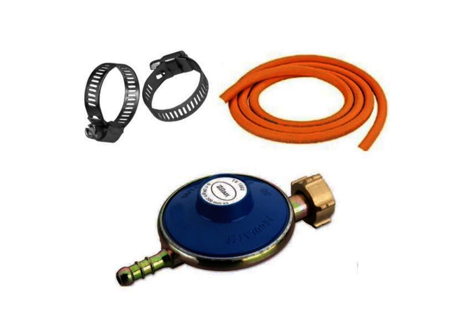 Set (Kit) regulator presiune (ceas), furtun gaz (2m.l.) si 2 coliere – ZLN9999, pentru alimentarea aragazurilor, pirostriilor sau incalzitoarelor ceramice. Realizat din materiale de calitate superioara, ceea ce confera o rezistenta si siguranta sporita in exploatare. Caracteristici : – Furtun flexibil din PVC, cu insertie textila, D=8mm., destinat pentru transferul gazului in domeniul casnic ; – Regulator (ceas) pentru butelie, corp metalic, – Presiune de intrare : 0.3 – 16 mbar ; – Presiune de iesire : 29 mbar ; – Capacitate : 0 – 15 Kg/ora.