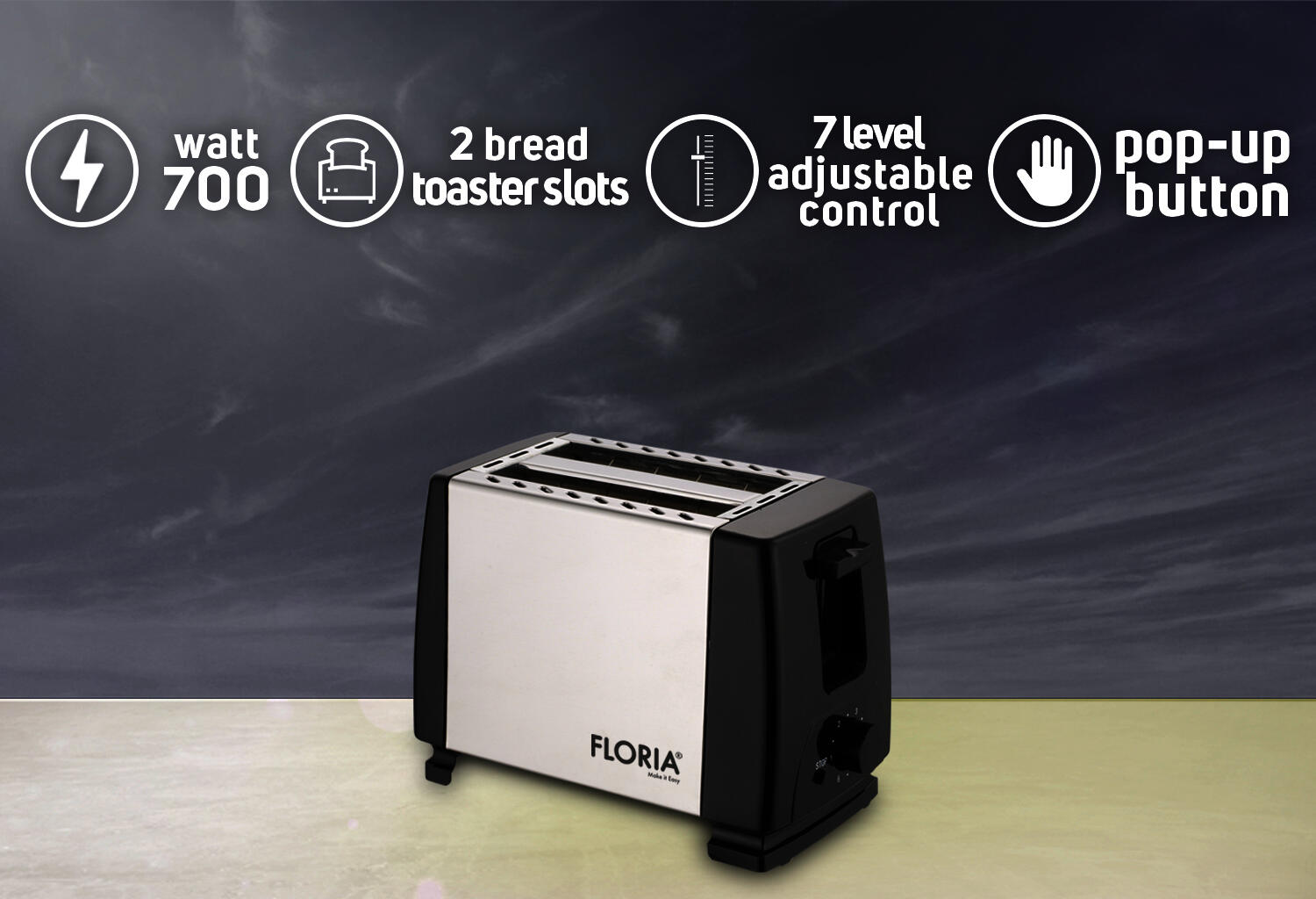 DescrierePrajitor de paine Floria ZLN1840 Negru/Inox, 700W 7 nivele de control al temperaturii, buton de oprireCapacitate: 2 felii de paineMicul dejun este o adevarata placere daca ai la indemana prajitorul de paine Floria ZLN1840. Acesta are o capacitate de 2 felii si este foarte usor de manevrat, ca sa prajesti painea exact asa cum iti doresti, in fiecare dimineata7 nivele de rumenirePotrivit pentru cei carora le place painea rumenita bine, dar si pentru cei care prefera varianta mai naturala, prajitorul de paine vine cu 7 trepte de control, care sa multumeasca toate gusturile.Design minimalistDesign-ul minimalist ii da o nota eleganta, integrandu-se perfect atat in cadrul unui design interior modern si cu atat mai mult al unuia retro.Panou frontal, usor de utilizatPentru acces usor la toate functiile: niveluri de rumenire, dezghetare, reincalzire, oprireButon de oprirePentru intreruperea in orice moment a ciclului de prajire.SpecificatiiCARACTERISTICI GENERALEUtilizareRezidentialNumar de felii2Trepte de prajire7Tip panou de comandaMecanicPutere700 WMaterial carcasaInoxCuloareInox / NegruDIMENSIUNILungime12 cmLatime24 cmInaltime16 cmGreutate0.74 Kg