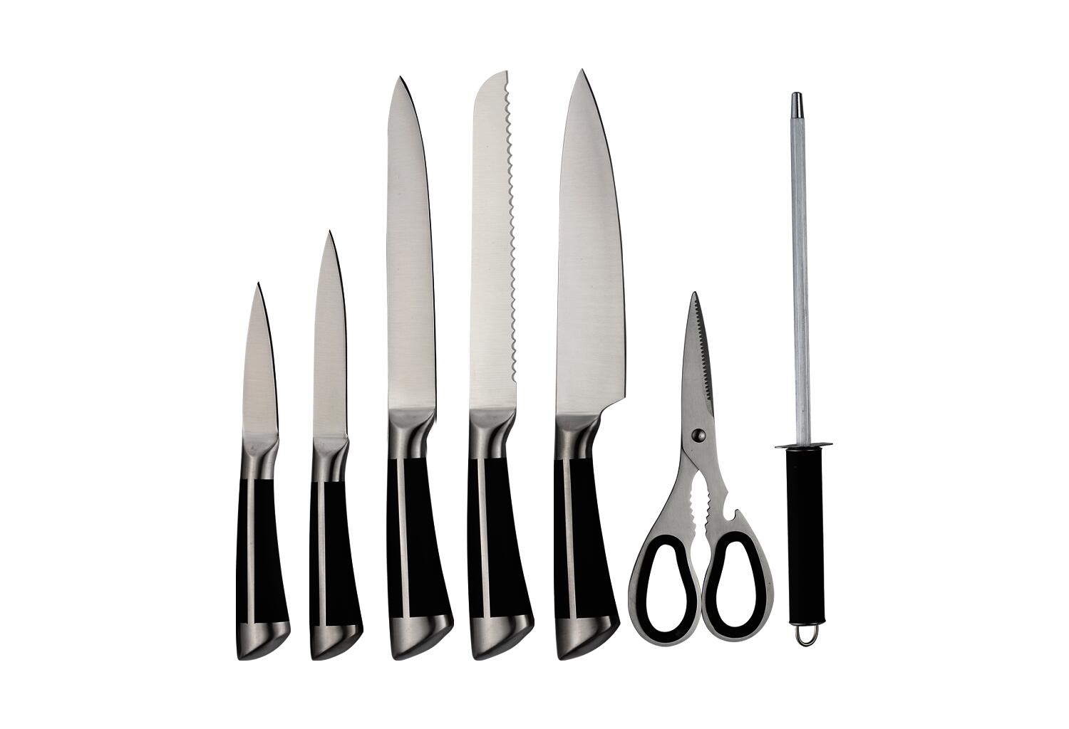 Setul de cutite Zilan ZLN1634 contine 8 piese, acestea fiind, 5 cutite, 1 foarfeca si 1 masat pentru ascutirea cutitelor. Manerele cutitelor sunt de culoarea neagra.Setul include:- Cutit Chef 8 ( 20 cm )- Cutit pentru taiat paine 8 ( 20 cm )- Cutit pentru feliat 8 ( 20 cm )- Satar 7 ( 18 cm )- Masat pentru ascutire 7.5 ( 19 cm )- Cutit utility 5 ( 12,7 cm )- Cutit 3.5 ( 9 cm )- Foarfeca- Suport acrilic de 360°Cutitele sunt construite din otel inoxidabil model 3CR13, maner ergonomic confortabil, cutitele sunt compatibile pentru a fi curatate la masina de spalat vase.